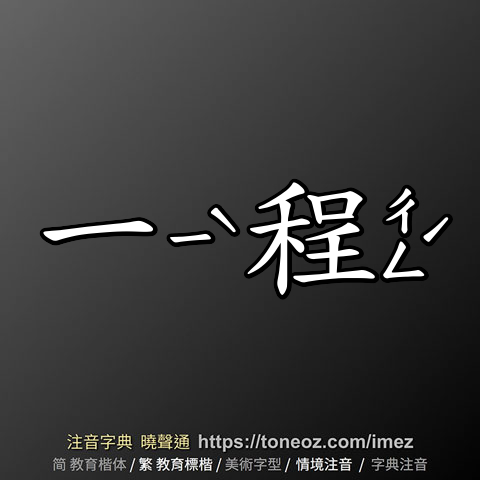 一程,注音ㄧ ㄔㄥˊ,拼音yī chéng,辭典解釋為:1.一段時間。《三國演義》第五一回:「吳軍趕了一程,自回。」也作「一程子」、「一程兒」。 2.一路。《警世通言.卷一三.三現身包龍圖斷冤》:「迎兒喫不得這廝罵,把裙兒繫了腰,一程走來小孫押司家中。」 3.立刻。《京本通俗小說.西山一窟鬼》:「嚇得吳教授目睜口呆,罔知所措。一程離了錢塘門。」