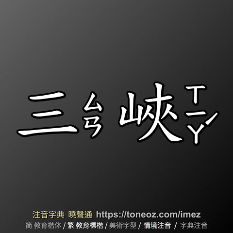 三峽,注音ㄙㄢ ㄒㄧㄚˊ,拼音sān xiá,辭典解釋為:瞿塘峽、巫峽、西陵峽的合稱。地當長江上游,介於四川、湖北兩省之間,長七百里,兩岸連山,絕無斷處,灘多水急,舟行甚險。