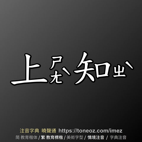 上知,注音ㄕㄤˋ ㄓˋ,拼音shàng zhì,辭典解釋為:具有高度智慧的聖哲。《論語.陽貨》:「惟上知與下愚不移。」《北齊書.卷三七.魏收傳》:「然則上知大賢,唯幾唯哲,或出或處,不常其節。」也作「上智」。