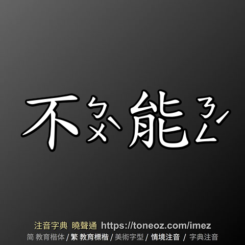 不能,注音ㄅㄨˋ ㄋㄥˊ,拼音bù néng,辭典解釋為:1.無法、不能夠。例:他家裡有事,今天不能來了。 2.能力不足、沒有能力。例:這事情沒做好的關鍵不是不能,只是做的人根本沒有用心。