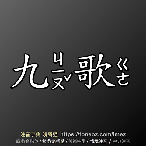 九歌,注音ㄐㄧㄡˇ ㄍㄜ,拼音jiǔ gē,辭典解釋為:1.楚辭篇名。戰國楚人屈原據楚地祭祀樂歌改作而成,分為〈東皇太一〉、〈雲中君〉、〈湘君〉、〈湘夫人〉、〈大司命〉、〈少司命〉、〈東君〉、〈河伯〉、〈山鬼〉、〈國殤〉及〈禮魂〉十一篇。 2.夏禹時的樂曲。《左傳.文公七年》:「九功之德,皆可歌也,謂之九歌。」《楚辭.屈原.離騷》:「啟九辯與九歌兮,夏康娛以自縱。」漢.王逸.注:「九辯,九歌,禹樂也。」
