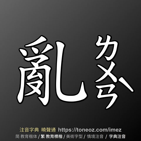 亂,注音ㄌㄨㄢˋ,拼音luàn,辭典解釋為:1.無條理秩序的。例:混亂、雜亂、快刀斬亂麻 2.煩雜、不安寧。例:心慌意亂、心緒煩亂 3.動盪、不安定。例:動亂、亂邦 4.叛變、造反。例:作亂、叛亂 5.混淆。例:以假亂真 6.任意、隨便。例:亂來、亂跑、亂說話 7.很、非常。例:亂沒原則、亂有意思的
