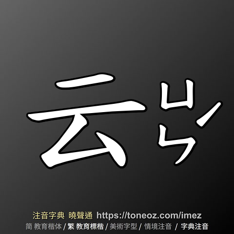 云,注音ㄩㄣˊ,拼音yún,辭典解釋為:1.說。例:人云亦云、不知所云 2.助詞。置於句尾,有「如此」的語氣。例:其為人也,發憤忘食,樂以忘憂,不知老之將至云爾。(《論語.述而》)