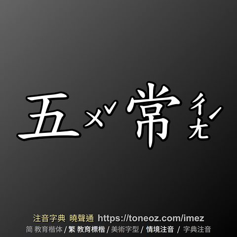 五常,注音ㄨˇ ㄔㄤˊ,拼音wǔ cháng,辭典解釋為:1.父義、母慈、兄友、弟恭、子孝等五種倫常道德。《書經.泰誓下》:「今商王受,狎侮五常。」唐.孔穎達.正義:「五常即五典,謂父義、母慈、兄友、弟恭、子孝五者。」 2.金、木、水、火、土五行。《禮記.樂記》:「道五常之行,使之陽而不散、陰而不密。」漢.鄭玄.注:「五常,五行也。」《周書.卷四.明帝紀》:「天地有窮已,五常有推移,人安得長在,是以生而有死者,物理之必然。」 3.仁、義、禮、智、信。《漢書.卷五六.董仲舒傳》:「夫仁誼禮知信五常之道,王者所當修飭也。」 4.古代指君臣、父子、兄弟、夫妻、朋友之間的五種倫理體系關係。元.陶宗儀《南村輟耕錄.卷一○.御史五常》:「人之所以讀書為士君子者,正欲為五常之主張也。使我今日謝絕故舊,是為御史而無一常。」也作「五倫」。 5.三國蜀馬良兄弟五人。他們的字中都有「常」字,時稱為「五常」。《三國志.卷三九.蜀書.董劉馬陳董呂傳.馬良》:「兄弟五人,並有才名,鄉里為之諺曰:『馬氏五常,白眉最良。』」