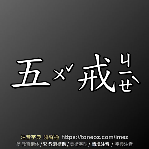五戒,注音ㄨˇ ㄐㄧㄝˋ,拼音wǔ jiè,辭典解釋為:佛教戒律的一種。指不殺生、不偷盜、不淫邪、不妄語、不飲酒等五項出家人應持守的戒律。例:五戒是佛教徒應守的清規。