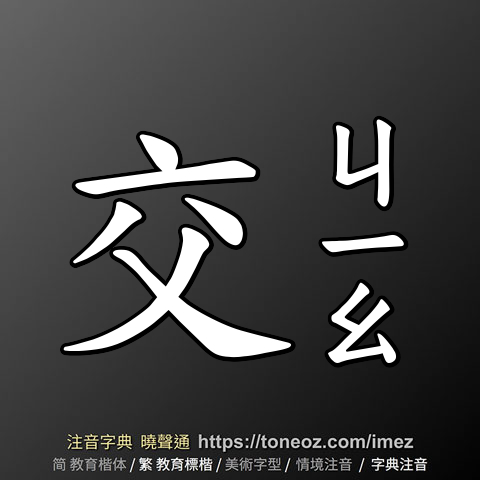 交,注音ㄐㄧㄠ,拼音jiāo,辭典解釋為:1.叉狀接合。例:兩線相交於一點。 2.互相往來。例:交朋友要謹慎。 3.授與、付給。例:交付、交貨、交辦 4.互相、彼此。例:交戰、上下交相賊 5.兩性媾合。例:交配、性交 6.錯雜、雜合。例:水乳交融、風雨交加 7.指相接的時候或地方。例:春夏之交、湘鄂之交 8.指買賣、生意。例:成交 9.指朋友、友誼。例:至交、刎頸之交