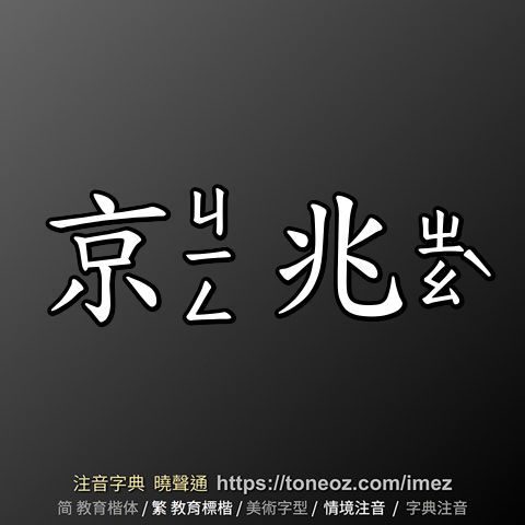 京兆,注音ㄐㄧㄥ ㄓㄠˋ,拼音jīng zhào,辭典解釋為:1.地名:(1)漢置,為京師三輔之一。參見「京兆尹」條。(2)民國初年改稱清順天府為「京兆」,直隸中央。民國十七年國民政府定都南京,遂廢入河北省。今北平市為其舊治。 2.職官名。漢代轄治京兆地區的行政長官。參見「京兆尹」條。