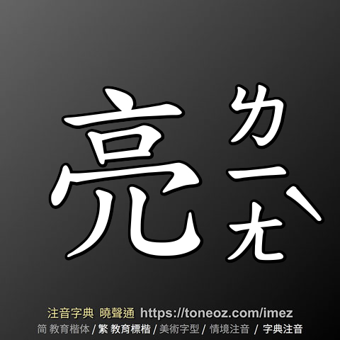 亮,注音ㄌㄧㄤˋ,拼音liàng,辭典解釋為:1.明朗、光明。例:明亮、亮晃晃、烏黑亮麗 2.聲音響亮清澈。例:宏亮、嘹亮、響亮 3.顯露、展示。例:亮票、亮牌、亮相 4.清楚、明白。例:亮察、心明眼亮 5.忠貞正直。例:亮直、高風亮節