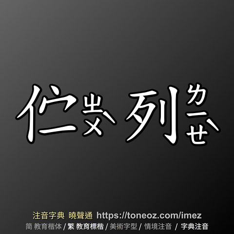 辭典解釋為:列,1.行次、行伍。例:行列 2.依次擺置。例:排列、陳列 3.類別、範圍。例:系列、討論之列 4.安排、放入。例:列入考慮 5.各、眾。例:列國、列祖列宗 6.量詞。計算成行成列的人或物的單位。例:一列火車...