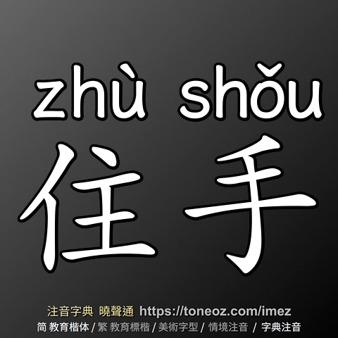 住手,注音ㄓㄨˋ ㄕㄡˇ,拼音zhù shǒu,辭典解釋為:1.停止手的動作。例:媽媽要小弟住手,不要再攪動魚缸裡的水。 2.停止做某件事。例:這件事不成功,他是不會住手的。
