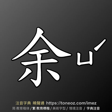 余,注音ㄩˊ,拼音yú,辭典解釋為:1.我,表第一人稱。例:余憶童稚時,能張目對日,明察秋毫。(《浮生六記.卷二.閒情記趣》) 2.姓。