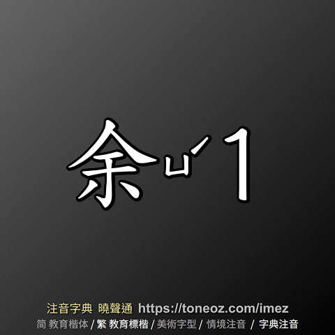 余1,注音ㄩˊ,拼音yú,辭典解釋為:[代] 我,表第一人稱。《文選.班彪.北征賦》:「余遭世之顛覆兮,罹填塞之阨災。」《文選.陸機.歎逝賦》:「余將老而為客。」 [名] 1.剩下、多餘。同「餘」。《周禮.地官.委人》:「凡其余,聚以待頒賜。」 2.姓。如宋代有余靖。