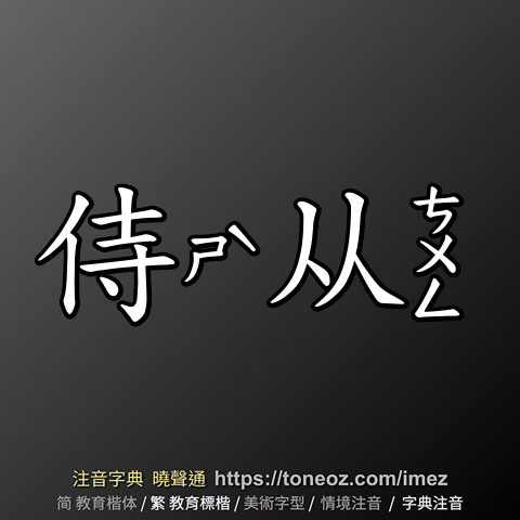 辭典解釋為:侍,1.隨從服務。例:服侍、侍食、侍飲 2.在尊長旁邊陪著。例:侍側、侍立 3.伺候或隨從的人。例:女侍、侍從、內侍...