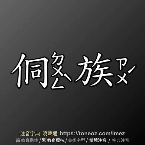侗族,注音ㄉㄨㄥˋ ㄗㄨˊ,拼音dòng zú,辭典解釋為:中國少數民族之一。分布於大陸地區貴州、廣西、湖南三省的交界地區,人口約二百五十萬。為古百越的一支。主要以水田農業為生,兼營林業。信仰多神,崇拜祖先與自然物。使用侗語,屬漢藏語系壯侗語族侗水語支。由於長期與漢人交往,語言亦雜有漢語的成分,通用漢文。男尊女卑,女子生育後才從夫居。住屋多為吊腳樓,倚斜坡建築。