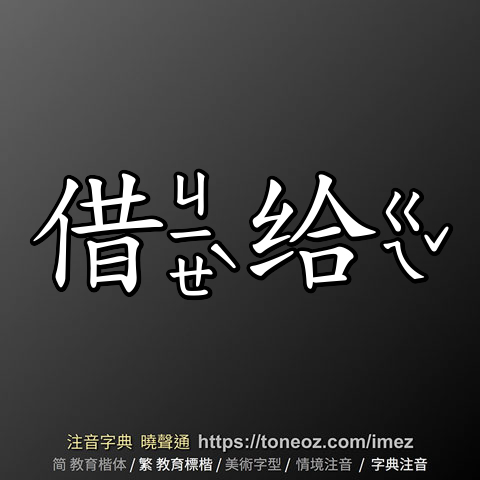 辭典解釋為:借,1.暫時向人告貸財物。例:他向朋友借了很多錢,到現在都沒還清。 2.把財物暫時給他人使用。例:這支筆借你用。  3.假託、利用。例:借刀殺人、借題發揮、借花獻佛 4.倚靠、憑藉。例:借重、借助...