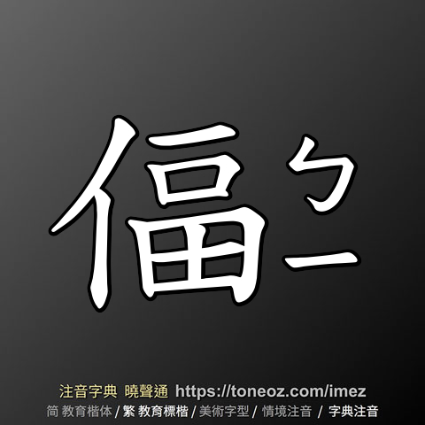 偪,注音ㄈㄨˊ,拼音fú,辭典解釋為:[名] 參見「偪陽」條。 [動] 屈服。通「伏」。《三國志.卷三五.蜀書.諸葛亮傳》:「又荊州之民附操者,偪兵勢耳,非心服也。」