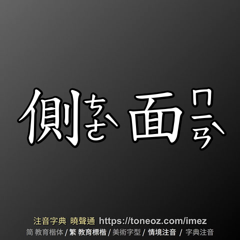 側面,注音ㄘㄜˋ ㄇㄧㄢˋ,拼音cè miàn,辭典解釋為:1.身體面部的側邊。例:請轉身,現在拍攝側面。 2.物體旁邊的一面。例:這棟大樓的逃生口位於電梯間側面。
