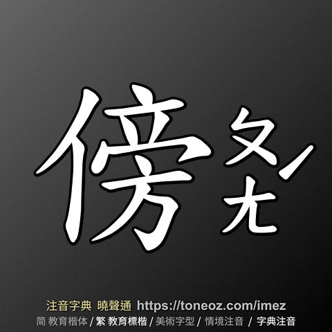 傍,注音ㄆㄤˊ,拼音páng,辭典解釋為:旁邊,通「旁」。例:「賜酒大王之前,執法在傍。」(《史記.卷一二六.滑稽傳.淳于髡傳》)