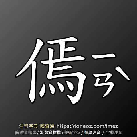 辭典解釋為:傿,英English: name of an immortal, ancient place name, surname Yan...