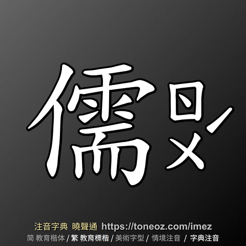 儒,注音ㄖㄨˊ,拼音rú,辭典解釋為:1.學者、讀書人。例:博學鴻儒 2.孔子所創的思想學派。例:儒家、儒道