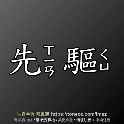 先驅,注音ㄒㄧㄢ ㄑㄩ,拼音xiān qū,辭典解釋為:在前面領導或開創事業的人。例:孔子是開創平民教育的先驅。
