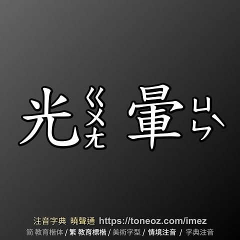 光暈,注音ㄍㄨㄤ ㄩㄣˋ,拼音guāng yùn,辭典解釋為:1.散發於發光物體四周邊緣的模糊光環。例:有幾隻飛蛾在路燈的光暈中旋繞飛舞著。 2.拍攝明亮的物體時,在物像周圍出現的暈圈,乃是底片受到反光或散光干擾所產生的現象。例:專家說這張照片是光暈所造成的效果,不是靈異現象。