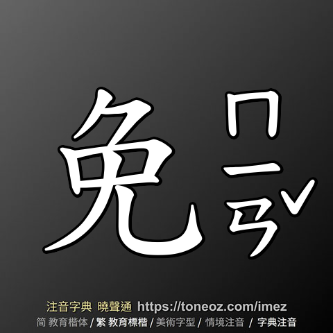 免,注音ㄇㄧㄢˇ,拼音miǎn,辭典解釋為:1.避開、脫逃。例:避免、倖免於難 2.去除、省去。例:免除、免費、減免 3.罷黜、革職。例:罷免、黜免 4.不必。例:免開尊口、免談