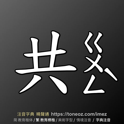 共,注音ㄍㄨㄥ,拼音gōng,辭典解釋為:1.給予。通「供」。 2.恭敬。通「恭」。