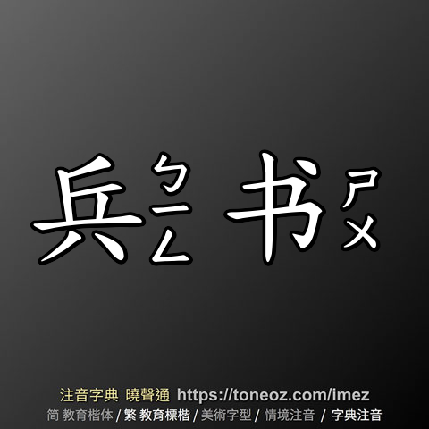 辭典解釋為:兵,1.武器。例:兵器、秣馬厲兵、短兵相接 2.戰士、軍隊。例:調兵遣將、按兵不動 3.戰爭。例:兵連禍結、兵荒馬亂 4.有關軍事或戰爭的事。例:紙上談兵、談笑用兵、兵不厭詐 5.專指軍隊中的基層成員。例:炮兵、步兵、傳令兵 6.姓。...