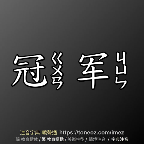 辭典解釋為:冠,1.超越、領先。例:獨冠群雄、豔冠群芳 2.加上。例:冠夫姓、冠罪名 3.古代為年滿二十歲的男子戴上帽子的成年禮叫「冠禮」,所以也稱成年男子為「冠」。例:弱冠 4.名次第一的、最優秀的。例:冠軍...