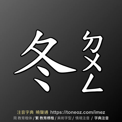 冬,注音ㄉㄨㄥ,拼音dōng,辭典解釋為:一年四季中,最寒冷的一季。農曆指立冬至立春的時期。以北半球氣候論,概指國曆十一月至翌年的二月期間。例:寒冬、殘冬、嚴冬