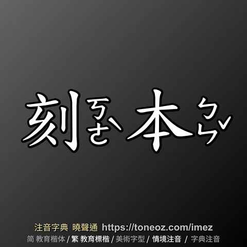 刻本,注音ㄎㄜˋ ㄅㄣˇ,拼音kè běn,辭典解釋為:雕板印成的書籍。如宋刻本、元刻本。《老殘遊記》第三回:「這是部宋版張君房刻本的莊子,從那裡得來的?」