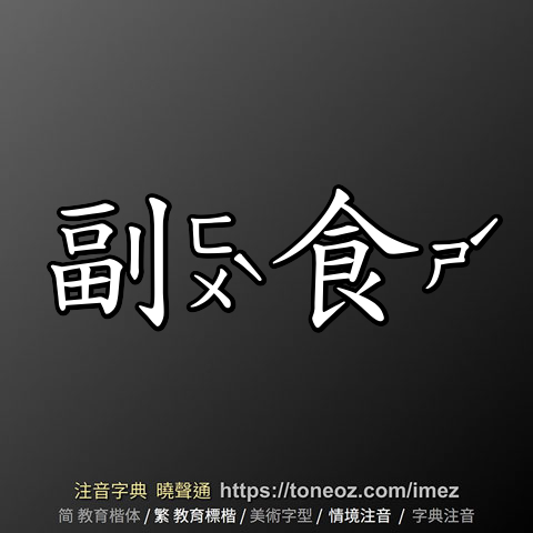 副食,注音ㄈㄨˋ ㄕˊ,拼音fù shí,辭典解釋為:別於主食的食品。如下飯的魚肉蔬菜等。例:除了主食以外,副食的營養也很重要。 △副食物