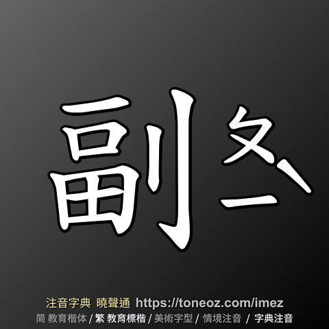 副,注音ㄈㄨˋ,拼音fù,辭典解釋為:1.職務是輔助的或擔任輔佐職務的人。例:副手、排副、副總統 2.附帶的。例:副作用、副產品 3.次要的。與「正」相對。例:副本、副業、副食品 4.符合、相稱。例:名副其實 5.量詞。計算成套、成組物品的單位。俗作「付」。例:一副碗筷、兩副耳環、三副眼鏡