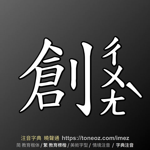 創,注音ㄔㄨㄤˋ,拼音chuàng,辭典解釋為:1.開始做。例:首創、草創、創制 2.開始的、獨特的。例:創見、創意、創舉