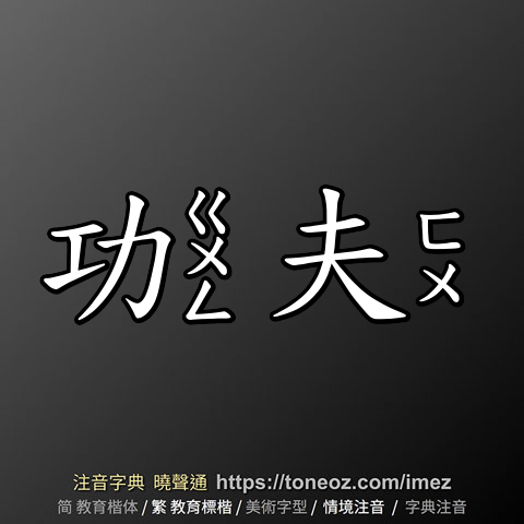 功夫,注音ㄍㄨㄥ ˙ㄈㄨ,拼音gōng fu,辭典解釋為:1.本領、造詣。例:他在國畫方面的功夫很了不得。 2.時間、精力。例:他花了很大的功夫才說服父母讓他去露營。