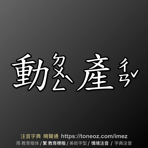 動產,注音ㄉㄨㄥˋ ㄔㄢˇ,拼音dòng chǎn,辭典解釋為:凡不需要破壞或變更而能全部移動其位置的財產,除不動產者外,其餘皆為動產。如金錢、糧食、衣物等。