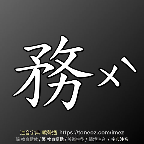 務,注音ㄨˋ,拼音wù,辭典解釋為:1.致力從事。例:務本、務農、務實 2.事情或工作。例:家務、事務、任務 3.必須、一定。例:務必、務請、務須 4.追求、謀取。例:貪多務得、貪多務廣