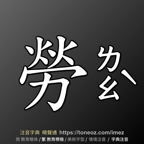 勞,注音ㄌㄠˊ,拼音láo,辭典解釋為:1.辛勤、努力做事。例:勤勞、操勞、不勞而獲 2.煩擾。為請人幫忙的客套話。例:偏勞、勞駕、勞煩 3.辛苦、疲累。例:旅途勞頓、積勞成疾、吃苦耐勞 4.成績、功勛。例:功勞、汗馬之勞 5.勞動者的簡稱。例:勞資關係、勞資雙方、勞資糾紛 6.姓。