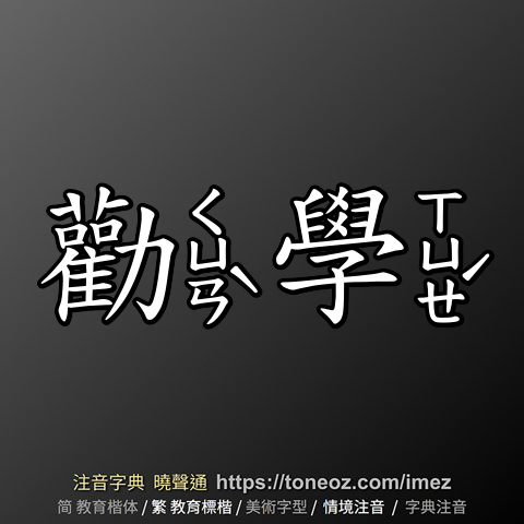 勸學,注音ㄑㄩㄢˋ ㄒㄩㄝˊ,拼音quàn xué,辭典解釋為:1.勸勉鼓勵人勤於學習。《左傳.閔公二年》:「敬教勸學,授方任能。」唐.孔穎達.正義:「勸學,勸民學問也。」《史記.卷一二一.儒林列傳.序》:「今陛下昭至德,開大明,配天地,本人倫,勸學修禮,崇化厲賢,以風四方,太平之原也。」 2.職官名。於宮廷、王府中專職主講經史諸書。《漢書.卷一○○.敘傳上》:「伯少受詩於師丹。大將軍王鳳薦伯宜勸學,召見宴昵殿。」 3.《荀子》篇名。東周戰國荀子著。全文論述求學的重要性,勉人為學精進不輟,應以達到聖人之境界為終。