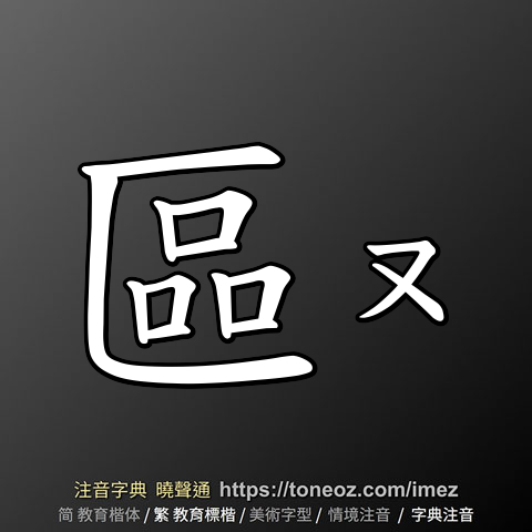 區,注音ㄑㄩ,拼音qū,辭典解釋為:1.分別。例:區別、區劃、區隔 2.一定範圍的地域。例:工業區、風景區、吸煙區 3.行政上劃分的地方自治單位。例:萬華區、大同區