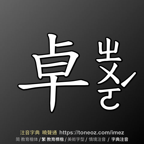 卓,注音ㄓㄨㄛˊ,拼音zhuó,辭典解釋為:1.高超獨特。例:卓越、卓見 2.直立。例:卓錫 3.姓。