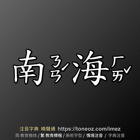 南海,注音ㄋㄢˊ ㄏㄞˇ,拼音nán hǎi,辭典解釋為:即南中國海,由中國大陸、臺灣、菲律賓群島、馬來群島及中南半島等環繞而成,為西太平洋的一部分。