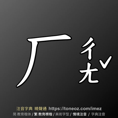 厂,注音ㄏㄢˇ,拼音hǎn,辭典解釋為:[名] 1.山邊可以居住人的崖洞。《說文解字.厂部》:「厂,山石之厓巖,人可居。」清.段玉裁.注:「厓,山邊也;巖者,厓也;人可居者,謂其下可居也。」 2.二一四部首之一。