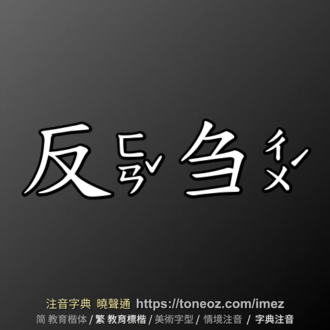 辭典解釋為:反,1.翻轉、顛倒。例:反敗為勝、易如反掌 2.背向自己方向的,或具消極、否定、異常意義的。與「正」相對。例:反面、反義、反常  3.不贊成,持抗議立場的。例:反核、反汙染 4.回、還。例:反省、反求諸己 5.出於正常判斷之外的。例:反而、畫虎不成反類犬 6.翻案。例:平反...