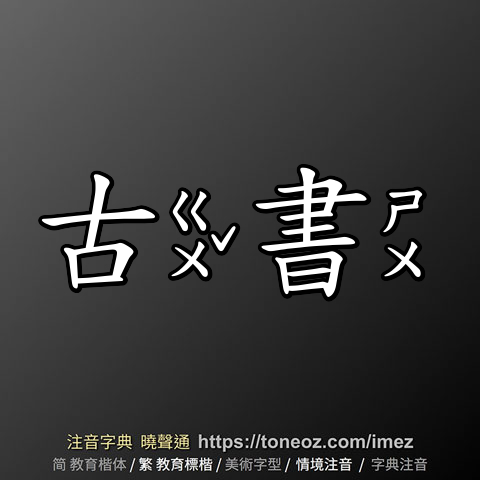 古書,注音ㄍㄨˇ ㄕㄨ,拼音gǔ shū,辭典解釋為:古代的典籍或著作。《三國演義》第三九回:「琦有一古書,請先生一觀。」