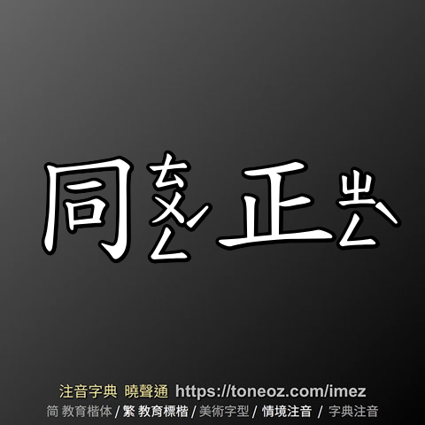 辭典解釋為:同,1.一樣的。與「異」相對。例:大同小異、異口同聲、志同道合 2.一齊、一起。例:同舟共濟、同甘共苦、同心協力 3.贊成。例:贊同、同意 4.會合、聚集。例:會同 5.和諧、和平。例:世界大同 6.和、與、跟。例:我同他一起看電影。 7.契約。例:合同 8.→胡同...