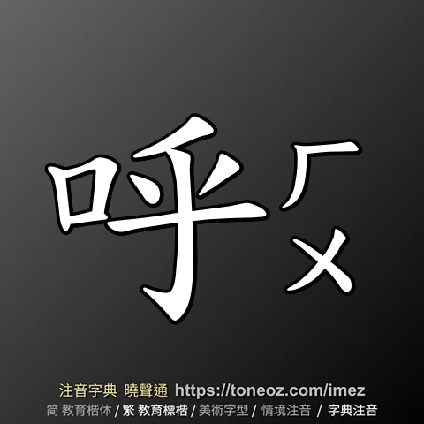 呼,注音ㄏㄨ,拼音hū,辭典解釋為:1.經口或鼻將氣體排出體外。與「吸」相對。例:呼氣 2.大聲吶喊。例:呼嘯、呼口號、大聲疾呼 3.招、叫。例:呼朋引伴、呼風喚雨、直呼其名 4.嘆詞。表示感嘆的語氣。例:嗚呼