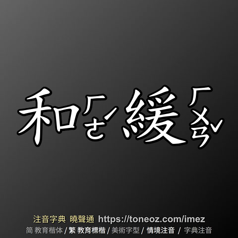 和緩,注音ㄏㄜˊ ㄏㄨㄢˇ,拼音hé huǎn,辭典解釋為:溫和舒緩。例:做完劇烈運動後,他休息了好一會兒,呼吸才和緩下來。