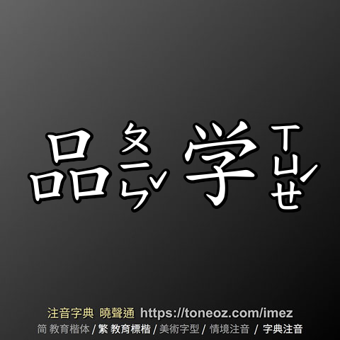 辭典解釋為:品,1.某一類東西的總稱。例:物品、食品、成品 2.事物的種類。例:花品、茶品 3.等級。例:上品、極品 4.人的德性。例:人品、品學兼優 5.評量、評斷好壞優劣。例:品詩、品文 6.細辨滋味。例:品酒、品嚐、品茗 7.吹奏樂器。例:品竹、品簫 8.古代官制中的階級。例:一品、官品 9.量詞。計算佛教經論篇章的單位。例:《大方廣佛華嚴經.阿僧衹品》...